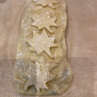 Fold one side over the filling and then fold the opposite side over it. Fold the ends closed and pinch the dough to seal. Try your best to seal the center seam. Try to flip the Wellington over so that the center seam is underneath. If you are not able to do so without breaking the Wellington leave the seam on top and do your best to cover it with decorations (see photo below). With the other crust, use cookie cutters to cut out fall designs and place them on top of your Wellington. Brush lightly with plant milk and make vent holes on the top of the Wellington. (Sprinkle top with nutritional yeast if you like an extra cheesy taste.) Bake for about 45 minutes or until browned.